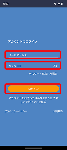 1.で登録したメールアドレスとパスワードを入力し、[ログイン]ボタンをタップしてください。
